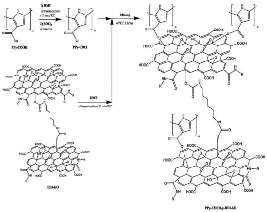 - Luceño Sánchez, J.A.; Peña Capilla, R.; Díez-Pascual, A.M. Grafting of Polypyrrole-3-carboxylic Acid to the Surface of Hexamethylene Diisocyanate-Functionalized Graphene Oxide. Nanomaterials 2019, 9, 1095. [Google Scholar] [CrossRef] [Green Version]