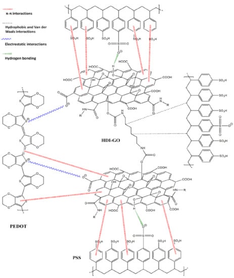 The interactions between PEDOT:PSS and hexamethylene diisocyanate (HDI)-modified GO have been investigated []. PEDOT chains can interact with the aromatic rings of GO and HDI-GO by π–π stacking as well as via electrostatic interactions between their negatively charged COOH groups and the positively charged PEDOT chains (Scheme 12). Moreover, their surface OH groups are disposed to interact with the negatively charged sulfonyl groups of PSS through H-bonding. In addition, HDI-GO can interact with the alkyl side chains of PSS via hydrophobic interactions and van der Waals forces. Thus, HDI-GO can interact strongly with both PEDOT and PSS chains, leading to a homogeneous dispersion within the matrix. The higher the functionalization degree of the GO, the stronger the interactions, the better the dispersion.