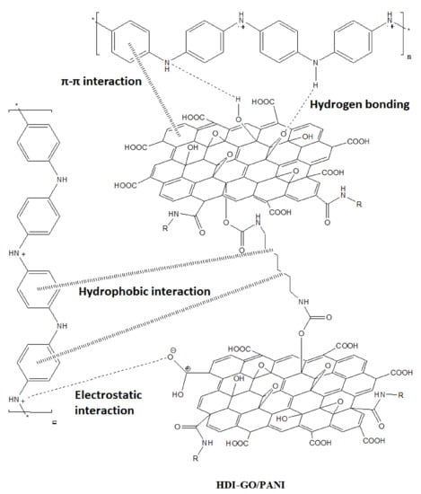 Similarly, different types of interactions, including H-bonding, π–π stacking, hydrophobic as well as electrostatic have been reported between PANI, in the form of emeraldine salt, and HDI-GO (Scheme 13), that result in improved interaction between the two nanocomposite components, hence very high electrical conductivity [].