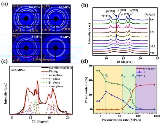 To quantify the changes in crystallization polymorphism, the 1D WAXD signals were decomposed into specific contributions from γ-, β-, mesomorphic, and amorphous phases, see the representative fitting in Figure 3c [36], which displays a representative fitting performed on the WAXD profiles. Figure 3d presents the changes of the phase contents as a function of pressurization rate, and three critical rates (indicated by dotted lines) were identified. For simplified analysis, the amorphous phase is not taken into consideration. It can be seen that, at the lowest pressurization rate of 0.6 MPa/s, only β- and γ-iPP were obtained with the fractions of 11% and 54%, respectively. When the pressurization rate increases to 1.9 MPa/s (denoted as R1), it causes an obvious decrease in γ-iPP crystallinity from 54% to 40%, but the crystallinity of β-iPP increases visibly from 11% to the maximum point of about 24%. The increase in β-iPP crystallinity is almost equal to the decrease in γ-iPP crystallinity, meaning that the content of β-iPP increases at cost of the γ-iPP [25,37]. Once that rate exceeds R1, β-iPP and γ-iPP crystallinities both decrease gradually. When that rate further exceeds 15 MPa/s (denoted as R2), the mesophase begins to emerge, and mesomorphic, β-, and γ-iPP coexist with each other. After reaching 75 MPa/s (denoted as R3), pure mesophase could be obtained and its fraction content reaches the maximum of about 32%. It is worth noting that with pressurization, the formation of metastable structures has been observed for different kinds of polymers, and for iPP pressurization can induce more effects than temperature cooling on the formation of mesophase [38,39].
