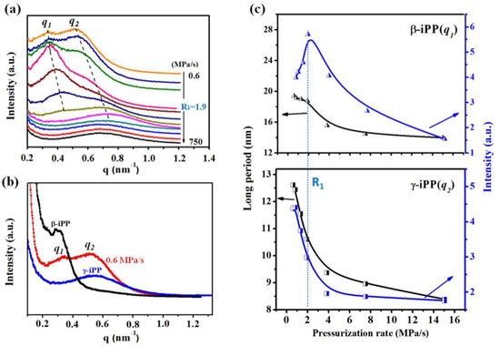 (a) Selected SAXS profiles of the iPP0.2 samples solidified by pressuring to 1.7 GPa at different pressurization rates; (b) Comparison of the SAXS profiles between pure β-, γ-iPP and the iPP0.2 samples prepared by pressuring at 0.6 MPa/s; (c) Changes in the maximal intensity of γ- and β-iPP as a function of pressurization rates.