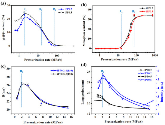 (a) Contents of β- and (b) mesomorphic phases of iPP0.2 and iPP0.5 as a function of pressurization rate; (c) Changes in D and (d) , of β crystal in iPP0.2 and iPP0.5 samples with pressurization rates.