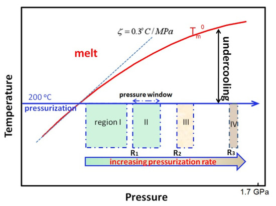 where is the atmospheric pressure, is the equilibrium melting temperature at . is the pressure dependence of the melting temperature and could be applied as 0.3 °C/MPa at low pressure, while in this case, (P) changes linearly with pressure. However, at a high pressure, is not a constant but decreases with increasing pressure. Considering the experimental results of the literature, and in order to simplify the problem, we assume that β and γ phases share the same temperature and pressure dependence [25]. Therefore, the crystallization behavior of iPP melts under pressurization treatment can be correlated with the same equilibrium melting temperatures, and accordingly, the solidification of iPP melts could be divided into four regions labeled I, II, III, and IV, respectively, as shown in Figure 8.