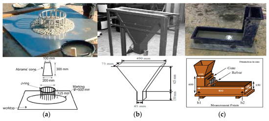 Standard SCC fresh property tests were performed, including the standard V-funnel tests, L-Box, and J-ring tests, to explore the fresh properties of SCC concrete [29,33,34,35]. The equipment utilized for testing the above-listed tests is shown in Figure 3.