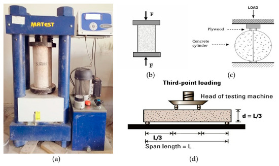 The primary characteristics that are considered for judging the quality, strength, and degradation of concrete are its mechanical properties (i.e., compressive strength, split tensile strength, and flexural strengths) [29]. They also depend upon the mix ratio, volume of aggregate, and the physical characteristics of materials [38]. Hardened characteristics play a vital role in the study of evolved concrete behavior; there are typically three main tests involved (as shown in Figure 4) in the study of concrete behavior: (i) compression test; (ii) indirect tensile test; (iii) flexural strength test.