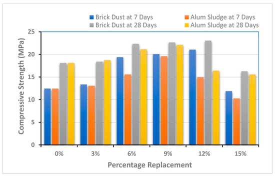The results concluded that with the increase of AS replacement percentage, both the compressive and split tensile strengths increased, but only up to a certain limit of 9% addition. After that, with increased ratios, the effective compressive strengths decreased due to the increased AS content and low cement content that caused lesser hydration reactions and failed to form the binding jell to hold aggregates in strength [39,40]. Brick Dust increased the effective strengths with up to 15% incorporation into the concrete, while after that, it showed a slight decrease.