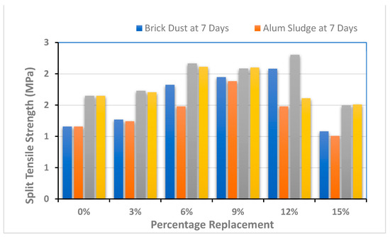 The testing results of split tensile strength are shown in Figure 6. The bar charts of Figure 6 demonstrate that the split tensile strength is increased initially with up to 12% and 9% replacement of BD and AS, a substitute to cement. The value of the tensile strength leads to a decrease with any more addition of these materials. SCC has shown the tensile strength of 1.16 MPa for the control sample at 7 days strength and 1.65 MPa for the control sample at 28 days strength. However, the addition of the optimum level of BD at 12% and AS at 9% showed improvement, and strength increased up to 2.08 MPa and 1.88 MPa for 7 days and 2.30 MPa and 2.10 MPa for 28 days curing, respectively. Likewise, the addition of BD and AS showed enhanced tensile strength properties up to 12% and 9% by weight of the cement. The maximum tensile strength was 2.30 MPa, which was found to be increased 28% more than the control sample by incorporating 12% of brick dust, whereas the maximum tensile strength with the addition of 9% of alum sludge as a replacement to cement was more than 21% when compared to the control sample.