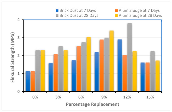 Graphical representation of flexural strength results is shown in Figure 7 and demonstrate that the flexural strength is increased initially with up to 12% and 9% replacement of BD and AS a substitute to cement. The value of flexural strength leads to a decrease with any more addition of these materials. SCC has shown a flexural strength of 1.14 MPa for the control sample at 7 days strength and 2.33 MPa for the control sample at 28 days strength. However, the addition of optimum levels of BD at 12% and AS at 9% showed improvement, and strength increased up to 2.90 MPa and 2.89 MPa for 7 days and 3.81 MPa and 3.40 MPa for 28 days curing, respectively. Likewise, the addition of BD and AS showed enhanced tensile strength properties up to 12% and 9% by weight the of cement. The maximum flexural strength was 3.81 MPa, which was found to have increased 64% more than the control sample by incorporating 12% of brick dust, whereas the maximum tensile strength with the addition of 9% of alum sludge as a replacement to cement was more than 46% when compared to the control sample. Hence, a recommended material as a partial replacement of cement can be Brick Dust.