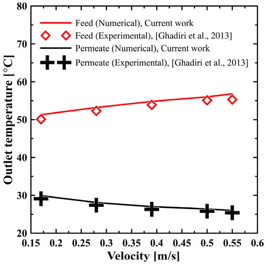 Furthermore, the introduced model has been experimentally validated with the available data []. The validation case captures the feed (hot salt water) and the permeate (cold pure water) outlet temperature at different flow velocities. This case was performed at typical conditions as mentioned in [], which are 60 °C and 20 °C feed inlet and cold water inlet temperature, respectively; and salt concentration of 1% with a counterflow regime. Figure 1 presents the validation result, which excellently fits the experimental work with an error of only 2.8%. The model was modified to be a three dimensional model, validated with the same date and recorded with the same solution. Accordingly, this model could be simply modified to be used for any proposed future work.