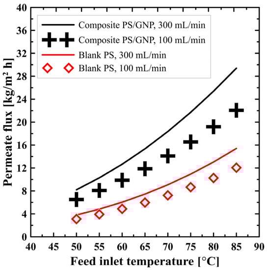 Effect of feed inlet temperature on the permeate flux at different flow rates for both blank PS and composite PS/GNP membrane.