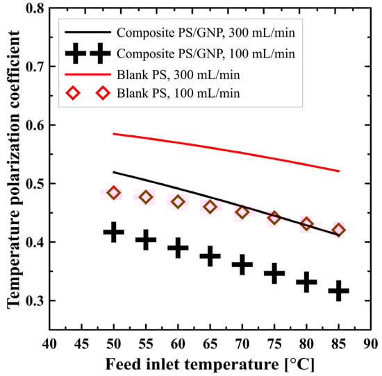 Effect of feed inlet temperature on temperature polarization coefficient at different flow rates for both blank PS and composite PS/GNP membrane.