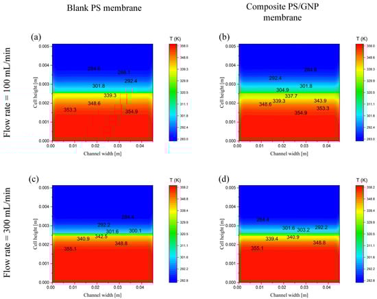 The temperature contours at maximum studied temperature, minimum and maximum introduced rates of flow for both fabricated membranes (blank PS and composite PS/GNP) are presented in Figure 8. Comparing the four introduced in Figure 8a–d, one can conclude that the highest thermal performance is that of the blank PS at the highest flow rate, as discussed in detail in the previous sections. These figures also show the temperature gradient from the hot side channel (feed channel) to the cold side (permeate channel), which follows the actual temperature gradient.