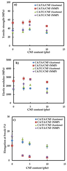 Tensile strength (a), elastic modulus (b), and elongation at break (c) of CA/TC/CNF and CA/TA/CNF in acetone and NMP solvent (Plasticizer content 30%).