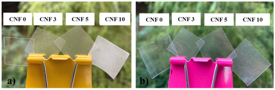 Digital photographs of plasticized CA/CNF films prepared in acetone (a) and NMP (b).