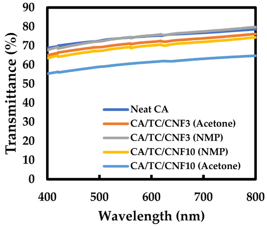 Good transparency is one of the advantages of CA. Because of its high transparency, CA is used for several applications such as high-quality frames for sunglasses, personal protective equipment, and sports goggles [32]. Therefore, when reinforcement is added into CA, it is expected that the transparency of CA could still be maintained. According to this result, NMP has become a possible alternative solvent to CA reinforced with CNF film for plastic application. Both TA and TC are clear colorless, thus the addition of plasticizers is not affecting the transparency of CA. UV-Visible spectroscopy was used to further compare film transparency. Figure 4 shows transmittance values of 68.7%, 64.9%, 67.7%, 63.4%, and 55.3% for neat CA, CA/TC/CNF3 (Acetone), CA/TC/CNF3 (NMP), CA/TC/CNF10 (NMP), And CA/TC/CNF10 (Acetone), respectively. Compared with acetone, CA film prepared with NMP has better transparency due to better dispersion of CNF in NMP than in acetone. This result is also supported by the tensile properties result where CA film prepared with NMP had higher tensile properties compared with CA film prepared with acetone.
