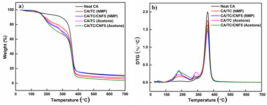 TGA (a) and DTG (b) graph of neat CA, CA/TC, and CA/TC/CNF5 in both acetone and NMP solvent.