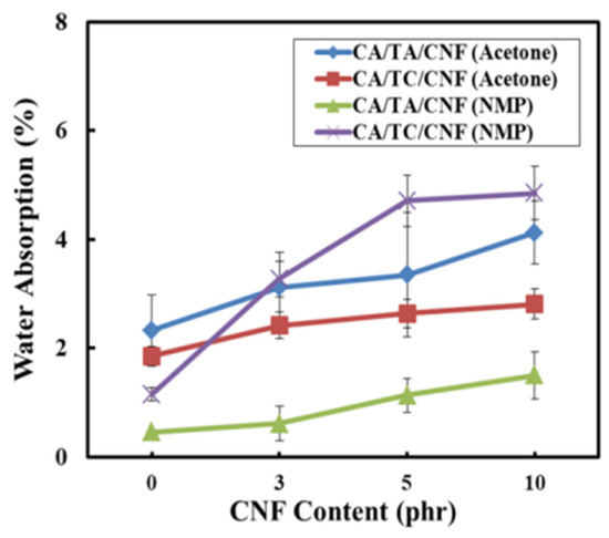 Water absorption of CA/TC/CNF and CA/TA/CNF with different CNF content prepared in both acetone and NMP solvent.
