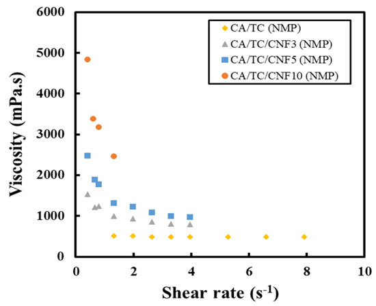 The viscosity of the CA/TC, CA/TC/CNF3, CA/TC/CNF5, and CA/TC/CNF10 samples was measured using a digital viscometer (DV-II+, Brookfield Engineering Laboratories, Middleborough, MA, USA). The temperature was maintained at 25 °C. The viscosity was measured with SC4-18 spindle at a range of shear rates from 0.4 to 132 s−1.