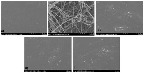 Fractured surfaces of CA/TC, CA/TC/CNF5, and CA/TC/CNF10 prepared in NMP samples were examined using a scanning electron microscope (SEM, S-4800, Hitachi, Ltd., Tokyo, Japan) in the Central Laboratory of the Kangwon National University. Samples were cryo-fractured using liquid nitrogen and directly used. Before the observation, the surfaces were sputter-coated with a platinum layer using a high-vacuum sputter coater (EM ACE600, Leica Microsystems, Ltd., Wtzlar, Germany) to avoid charging under the electron beam. The morphologies were observed at an accelerating voltage of 5 kV with a working distance of 8.5 mm.