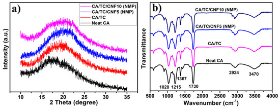 XRD patterns of neat CA, CA/TC, CA/TC/CNF5, and CA/TC/CNF10 in NMP solvent are shown in Figure 10a. Neat CA exhibited weak cellulose peaks at 2θ = 18–22°. This is because CA has a substitution degree at ~2.5 where most of the hydroxyl group on cellulose are replaced with acetyl groups. As a result, intermolecular hydrogen bonding is absent or minimal, destroying the ordered crystalline structure [38]. Addition of TC caused no significant difference. However, the addition of CNF into CA matrix slightly increased the intensity of the peak in the 2θ = 18–22° range. No significant cellulosic peak was observed at 2θ = 18–22°, even at high CNF content (CA/TC/CNF10), indicating the CNF is uniformly distributed throughout the CA matrix. Figure 10b shows the FTIR spectra of neat CA, CA/TC, CA/TC/CNF5, and CA/TC/CNF10 in NMP solvent. For neat CA, the peak at 3470 cm−1 can be attributed to the O-H bond stretching, and the peak at 2924 cm−1 is for C-H stretching. The characteristic peak at 1730 cm−1 is assigned for carbonyl stretch of the acetate function and the peak at 1367 cm−1 can be assigned to C-H bending. Peaks at 1215 cm−1 and 1028 cm−1 can be ascribed to C-O stretch in C-O-H and in the C-O-C group respectively [1]. No significant changes in the peaks were observed after the addition of TC and CNF. Only a slight change in the intensity and shape of C-O peak at 1215 cm−1 was observed. This might be due to their uniform distribution and low loading content.