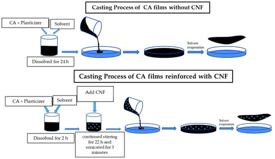 In this study, CA was plasticized using two different kinds of eco-friendly plasticizers, TA and TC. Plasticized CA was then reinforced with CNF to improve the mechanical properties of the composite. CA film was prepared with a solvent casting method using two different solvents (acetone and NMP). The effect of plasticizer type, solvent type, and CNF amount on film properties were investigated. The novelty of the present work lies in the manufacture and comparison of the properties of new CA/CNF films using two different solvents so as to indicate the better solvent for film making.