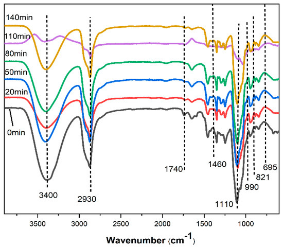 At 2930 cm−1 and 1460 cm−1, the stretching and bending vibrations of C-H in methylene were respectively observed. The strength of these two peaks first increased, then decreased, and then increased. The peaks of 2930 cm−1 and 1460 cm−1 were the stretching and bending vibration of C-H in methylene, respectively. The strength of these two peaks first increased, then decreased and then increased. This enhancement may be due to the cracking of lignocellulose, as shown in Figure 2, or the phenol hydroxyl group of phenylpropane structure of poplar powder participating in the liquefaction reaction, as shown in Figure 3. At this time, the small solvent molecules were immersed into the macromolecular structure of poplar powder through alkylation reaction. Its weakening may be due to the polycondensation of lignin. Most of the increased methylene is due to the introduction of PEG400 into the lignocellulosic structure, as shown in Figure 3.