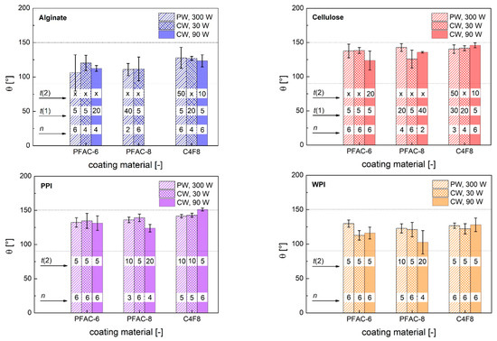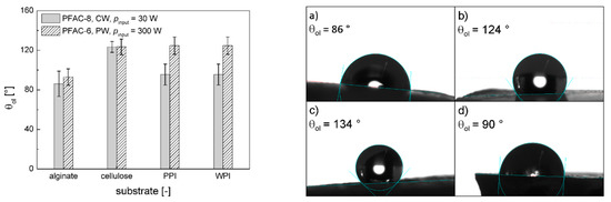 θol for different substrate/coating combinations. Values in the overview (left) represent the average at different process times under a given process condition (as indicated in the legend); error bars represent the standard deviation (n = 6). Raw data (right) represent exemplary process settings: (a) alginate, t = 5 min, PFAC-8, CW, pinput = 30 W, (b) cellulose, t = 10 min, PFAC-6, PW, pinput = 300 W, (c) PPI, t = 5 min, PFAC-6, PW, pinput = 300 W, (d) PPI, t = 5 min, PFAC-8, CW, pinput = 30 W.