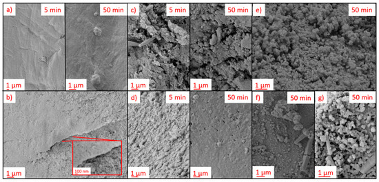 SEM pictures of external coating on different aerogels: (a) alginate, C4F8, CW, pinput = 90 W, (b) WPI, C4F8, CW, pinput = 90 W, (c) cellulose, C4F8, CW, pinput = 90 W, (d) PPI, C4F8, CW, pinput = 90 W, (e) alginate PFAC8, CW, pinput = 30 W, (f) PPI, PFAC-6, CW, pinput = 90 W, (g) PPI, PFAC-8, CW, pinput = 30 W.