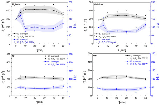 A negative effect of the coating process on the specific surface area was indeed not detected, showing that the porous structure remained intact during the process under all process conditions. In contrast, a significant increase in ΔSV in specific surface areas of treated substrates up to ΔSV = +179 m2/g (corresponding to an increase up to +61%) was determined (Figure 5). The average change of SV depended strongly on the aerogel nature (+ ΔSv alginate > cellulose > PPI > WPI), whereas the individual combinations with coating materials, the process settings and the process time also played important roles. A generally equal influence of the process time was found for all individual settings: The maximum ΔSV was reached after a process time of 10 min, followed by steady state conditions in the range of t = 10–40 min and a slight decrease when running the process for 50 min. Furthermore, the highest changes occurred using C4F8 monomer in PW/pinput = 300 W mode in all cases, which is therefore presented separately (circles in Figure 5).