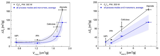 For example, pristine alginates have = 8.6 cm3/g (see Figure 6) and the average macropore size is = 237 nm (see Section 3.1), which yields via Equation (7) a value = 145 m2/g. This value corresponds to non-detectable specific surface area due to macropores only. If we then assume that the pore length does not change significantly during the plasma coating, from Equation (6) we readily have