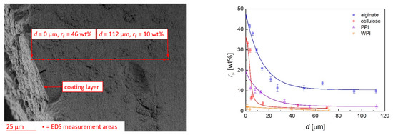 Transport of coating material into the pores was verified via EDS spectroscopy of cut-open substrates, an example of which was carried out for C4F8-coating. The thin coating layer and the inner porous part were clearly distinguishable on the corresponding SEM images and the distance d (max. 112 µm) from the outer layer was determined accordingly (Figure 7 left). The amount of fluorine was calculated as relative abundance rF in relation to oxygen and carbon. Significant amounts of fluorine were detected in the inner part of the aerogels, which is a proof of the penetration of monomer molecules into the substrates. The overall fluorine content in the pores was related to the distance d from the outer layer, while the initial value of rF on the surface varied significantly with the aerogel nature (Figure 7, right). The latter can be expected to depend mainly on the adhesion between monomer and substrate, resulting in significantly higher values of rF for the more polar polysaccharide aerogels. The exponential decay of rF spoke to a significant mass transport limitation of monomer diffusion into the bulk of the aerogels. The value of rF remained mostly constant in the inner part of the substrates.