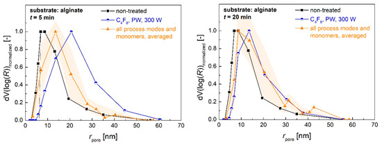 Furthermore, it was demonstrated that new adsorption sites in the pores were formed during the process, resulting in a significant increase of up to 61% in the specific surface area. Maximization of ΔSV was achieved in the PW mode, using C4F8 as monomer. A steady state was reached after t = 10–40 min, resulting in constant values of ΔSV under the given process conditions. Relations of the ΔSV with the overall aerogel porosity as well as individual macro- and mesopore volumes were identified. It was shown that high porosities ≥ 90% are necessary for achieving high effects of ΔSV ≥ 100 m2/g. While changes of the BET C constant indicated the generation of moieties with lower surface energies in polysaccharide gels, the penetration of coating material into the pores was proven via EDS analysis of cut-open substrates. The results indicate that two main effects determine the intrusion depth and final fluorine concentration in the pores: (1) the adhesivity of the substrate material to the activated monomers and monomer fragments; (2) the composition of the porous structure, whereas an interconnected, highly macroporous network is beneficial for a good transport of monomer into the structure. The dynamic changes of the mesoporous pore structure during the process, as determined via BJH desorption analysis, led in the case of alginate aerogels to a decrease in pore volume from small mesopores in the range of rpore ≤ 10 nm and an increase in the range of rpore approximately 15–60 nm. Estimations based on geometric and mass balance aspects showed that the observed increase in the specific surface area may result from two processes: (i) polymer deposition at coupling points of macro- and mesopores and (ii) due to intrinsic porosity of the deposited polymer layer.