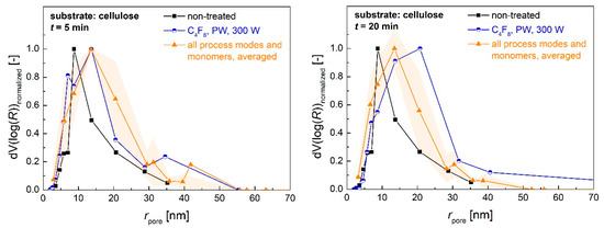 Comparison of BJH pore size distributions (normalized) from alginate (top) and cellulose (bottom) aerogels prior to and after the plasma coating process. Round data points represent the values obtained after coating with C4F8 in PW mode with pinput = 300 W; triangular data points represent the averaged values obtained after all other coating process conditions, excluding PFAC-8 coating in CW mode with pinput = 90 W. Error areas represent the standard deviation from averaged values.