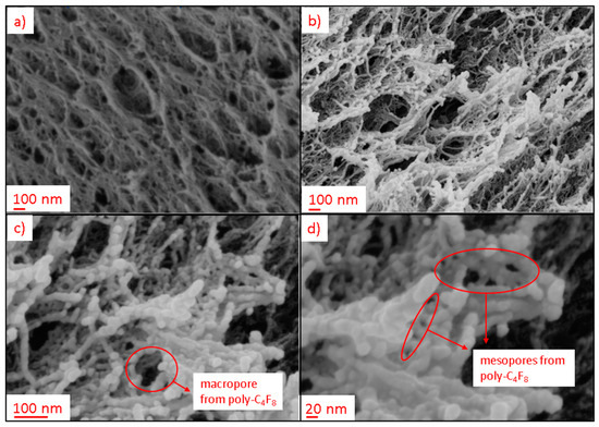 SEM pictures: (a) porous structure of non-treated alginate aerogel; (b) porous structure of treated alginate aerogel, coating material C4F8, CW, pinput = 90 W, t = 50 min, distance from outer layer = 134 µm; (c) and (d) high-resolution pictures of poly-C4F8 in alginate aerogel and new pores generated thereof.