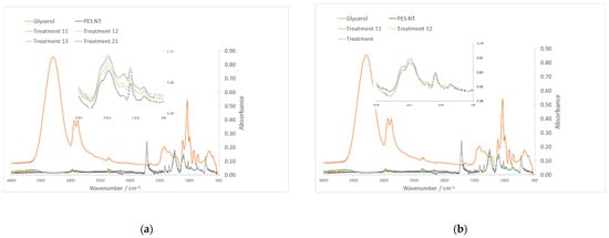 The ATR-FTIR spectra of GL, nontreated PES and GL-treated PES fibers (Table 4) were obtained to determine the presence of GL on the fibers. The spectra of the treated fibers before and after rinsing are visualized in Figure 1a,b, respectively. The GL peaks at 3300 and 1040 cm−1 corresponded to the associated OH stretching and C–O stretching. These bands can be clearly seen in the GL-treated textiles before rinsing but are less obvious after rinsing, and they were more prominent for treatments 11 and 13. After rinsing, only a small increase in a broad peak at higher frequencies ≈ 3600 cm−1 was observed, which could correspond to free OH stretching resulting from the small residual glycerol or NaOH content as well as the slight increase in moisture absorption in some of the cases.