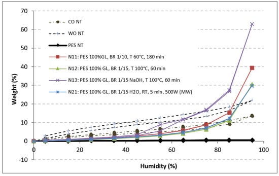 The percentage of absorption and desorption of water at different RHs obtained based on the DVS of PES-, CO- and WO- and GL-treated fibers is graphically shown in Figure 3. Plain PES generally did not absorb/desorb water at all RHs (less than 1%), and WO presented a sigmoidal shape, with a maximum moisture absorption of 14 and 22%, with a marked hysteresis between desorption and absorption, which is common in natural fibers. The GL-treated fibers presented higher moisture than PES, which drastically increased at high RH. However, the shape and hysteresis observed in the sample treated with NaOH (treatment 13) demonstrated superficial dissolution of PES [34]. The rest of the PES treatments that did not exhibit hysteresis showed that the moisture did not modify the PES sufficiently to reach the behavior of natural fibers (CO and WO), where clear hysteresis occurred.