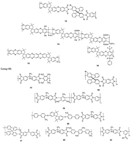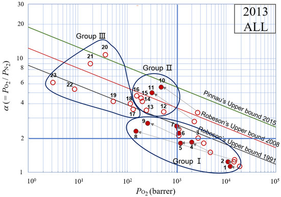 Figure 3 shows plots of top-performing polymers showing the highest α at each PO2 reported in the literature until 2013. The values and categorization are listed in Table 1 [14,15,16,17,18,19,20,21,22,23,24,25,26,27,28,29,30,31,32,33,34,35]. The chemical structures of the polymers showing the best performances are shown in Chart 1. These polymers can be categorized into the following three groups. Group I: polymers 1–9 with the highest PO2 and the lowest α below the 1991 upper line, Group II: polymers 10–16 with relatively high α and intermediate PO2 beyond the 1991 upper line and close to, or on, the 2008 upper line, and Group III: polymers 17–23 with the highest α and the lowest PO2 close to the 1991 upper line. Typical polymers categorized into Groups I, II, and III are poly (substituted acetylenes) (PAs) such as PTMSP, Spiro-PIMs (polymer of intrinsic microporosity with spiro-carbons), and polyimides (PIs), respectively. The details are described below.
