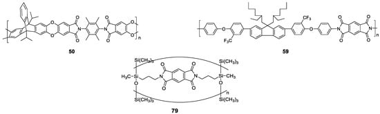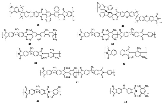 Figure 5 shows plots of the best PIs until 2013. Table 3 lists the detailed data for the polymers in Figure 5 [52,53,54]. They are amorphous and have very high Tg values, that is, they are glassy polymers. Conventional PIs are known as insoluble polymers and, therefore, they have no direct processability and their membranes are prepared from their soluble precursor polymers called poly(amic acid)s [55]. However, by introducing bis(trifluoromethyl)methylene (-(CF3)2C-) to the main chain of PIs, they became soluble and therefore direct fabrication to their membranes became possible. The bulky groups inhibit efficient packing of the polymer chains resulting in higher permeability. In fact, almost all the PIs showing the best performances here in Figure 5 include the fluorine-containing group (-(CF3)2C-), except for polymers 40 and 43 and PIM-PIs (35, 36, 18, 20, and 21)) (Chart 1 and Chart 3). The PIs can be classified into two groups. One group contains a lot of methyl groups (polymers 17, 19, 22, 37–44) and the other have contorted spiro carbons (polymers 18, 20, 21, 35, and 36; PIM-PI, the details are described above). The PIs with many methyl groups (39, 19, 41, 22) had relatively high densities around 1.3–1.4 and low FFVs of about 10–20%. However, they had relatively large spaces between macromolecules, because their d-spacing values from XRD were 0.46–0.57 nm [56] and their pore sizes by PALS [48] were 0.6–0.7 nm. In other words, these PIs may contain ultramicropores (<0.7 nm). It was reported that their selectivities of permeation (α) through these PIs mainly depended on those of diffusion (αD) and those of dissolution (αS) were almost unity (<1.2) [32,52]. Therefore, since the permeation may involve the MS mechanism, relatively high α values are shown. However, since they have no large micropores (0.7–1.0 nm), unlike PTMSP, their PO2 values were low.
