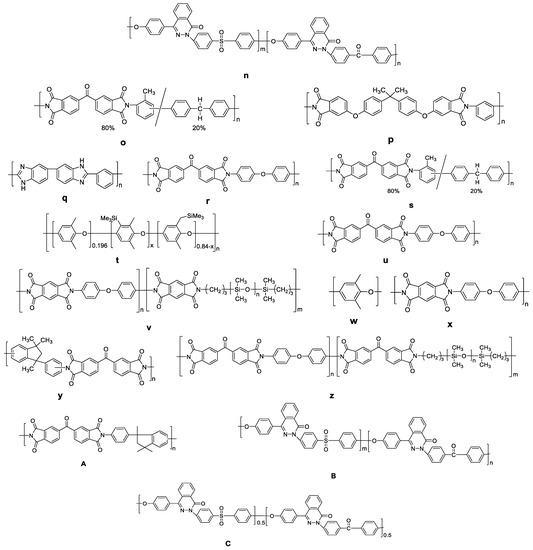 2.1.5. Polyimides (PIs) (Group III: 17–23 in Chart 1 and Figure 3, and 35–43 in Chart 3 and Figure 5)