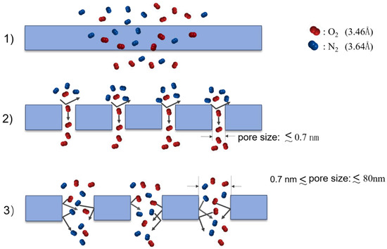 The MS separation mechanism for an oxygen/nitrogen mixture may be applied to permeations through membranes containing micropores whose sizes are less than around 5–10 Å (0.5–1 nm) because the pore sizes should be less than 2–3 times of the size of the permeating gas molecule (0.346 nm) The IUPAC defined the terms “ultra-micropores” and “micropores” as small pores with sizes of less than 0.7 nm and 2 nm, respectively. Therefore, for highly oxygen permselective membranes based on the MS mechanism, ultra-micropores are appropriate and micropores are too large.