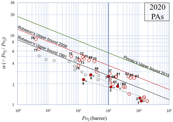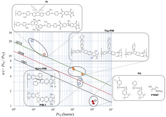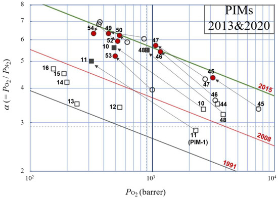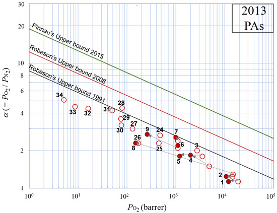In the plots of the best polymers until 2013 (Figure 3), although the plots of the polymers showing high PO2 of more than 103 (PDPAs) are below the 1991 upper bound line, the polymers (10–16) showing intermediate PO2 values from 102 to 103 are located above the 1991 upper bound line. All these polymers are called PIMs (polymers of intrinsic microporosity) and related PIMs. Therefore, the new class of polymer contributed significantly to the appearance of the new improved 2008 upper line.