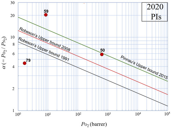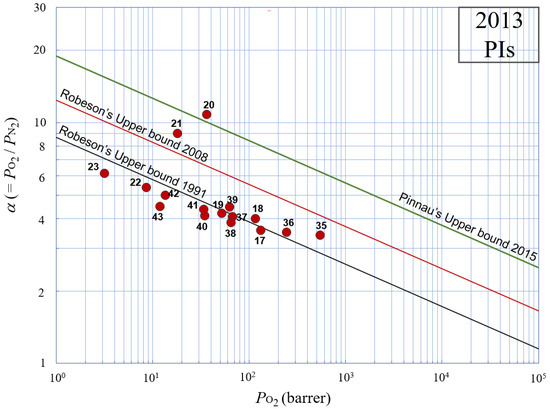 In Figure 3 for all the best polymers until 2013, polymers 17–23 show high α values and low PO2 values. They are all polyimides (PIs). Among them, polymers 20 and 21 show the top two highest α values. They contain contorted backbones. Therefore, they are also categorized as Spiro-PIM-PI as mentioned above.