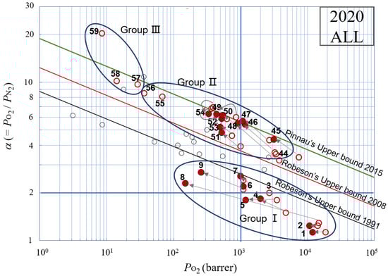 Robeson’s 1991, 2008, and Pinnau’s 2015 upper bound lines for oxygen/nitrogen permeation through polymer membranes with plots for milestone polymers (●: after aging, ○: before aging).