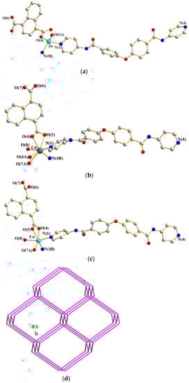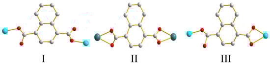 Moreover, the 1,4-NDC2− ligand of 1 bridge two Zn(II) ions through two carboxylate oxygen atoms from two carboxylate groups to reveal the coordination mode I, while those of 2 and 3 chelate and bridge two metal ions through four carboxylate oxygen atoms, coordination mode II, and three carboxylate oxygen atoms, coordination mode III, respectively (Figure 3). Noticeably, while the Zn(II), Cd(II) and Co(II) metal centers of 1–3 adopt the distorted tetrahedral, pentagonal bipyramidal and octahedral (square pyramidal) geometries, respectively, giving rise to different coordination modes for the 1,4-NDC2− ligands; their structural topologies are not subject to the metal identities.