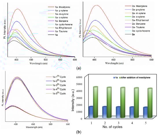 (a) Emission spectra of activated 1 (left) and 2 (right) loaded with different VOC’s. Emission spectra showing the recyclability of (b) 1a and (c) 2a exposed with mesitylene for five repeated cycles.
