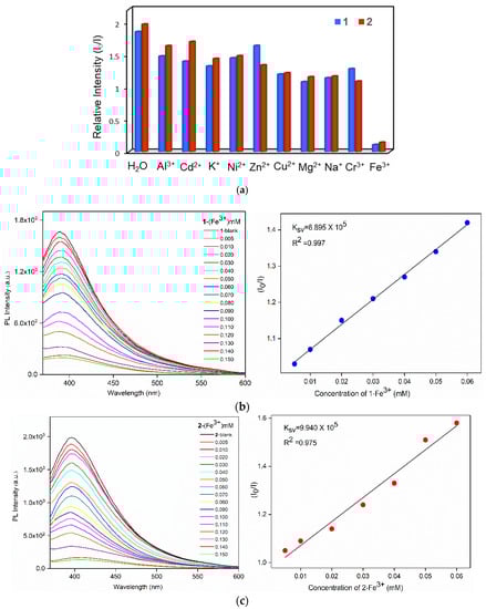 In order to explore the potential application of 1 and 2 in luminescent sensing of metal cations, 30 mg samples of 1 and 2, respectively, were immersed into 10 mL aqueous solutions of nitrate salts M(NO3)x (M = Al3+, Cd2+, Cu2+, Mg2+, Ni2+, Zn2+, Na+, K+, Cr3+ and Fe3+) with a concentration of 1 × 10−3 M. After 1 h, the solids were filtered and then the solid-state emission spectra were measured at room temperature. As shown in Figure S20, remarkable luminescence quenching of about 95% for 1 and 92% for 2 were found in the detection of Fe3+ ions. To further explore the quenching effect of Fe3+ ions, sensing dependence of luminescence intensity on the concentration of Fe3+ was investigated by immersing finely grounded samples (30 mg) of 1 and 2 into Fe3+ aqueous solutions with various concentrations (0.005–0.15 mM) for 1 h. As shown in Figure 5b,c (left), the emission intensities were getting lower and almost completely quenched upon increasing the concentration of Fe3+. Quantitatively, the quenching capacity of Fe3+ ion can be rationalized by the Stern–Volmer equation: I0/I = 1 + Ksv × [Q], where [Q] is the concentration of Fe3+, Ksv is the quenching constant, and I0 and I are the emission intensities in the absence and presence of Fe3+, respectively [37]. As demonstrated in Figure 5b,c (right), the titration curves for Fe3+ ions in 1 and 2 are virtually linear at low concentrations, which gave the linear correlation coefficient (R2) of 0.997 for 1 and 0.975 for 2, respectively, while the S-V curves at higher concentrations became nonlinear, which can be described by concurrent dynamic and static quenching or the self-absorption process. The Stern−Volmer constant (Ksv) values are 6.895 × 105 for 1 and 9.940 × 105 M−1 for 2, respectively, in the presence of Fe3+.