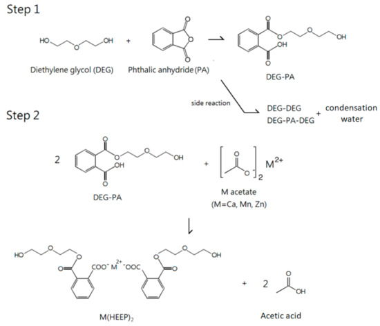 The 4 moles of DEG and 1 mole of PA were first mixed in a four-neck reaction flask (Sheng Huei Instrument Corp., Taichung, Taiwan) and heated to a constant temperature of 135 °C for 1.5 h. Secondly, 0.5 moles divalent metal acetates including calcium acetate, manganese acetate, and zinc acetate were added, respectively. Then the reaction temperature was raised to 162 °C for calcium acetate, 150 °C for zinc acetate, and 140 °C for manganese acetate, respectively, and all the reactions were maintained for 3 h. During this process, modified equipment by introducing a glass water separator (Sheng Huei Instrument Corp., Taichung, Taiwan) and using thermal insulation materials to maintain the whole system temperature at 120 °C was used for collecting the condensation water completely. Finally, the ethyl acetate and xylene were used to wash the cooled mixture repeatedly. The M(HEEP)2 powders were dried in a 60 °C oven (Sheng Huei Instrument Corp., Taichung, Taiwan) for 3 days. The synthesized process is listed in Figure 1.