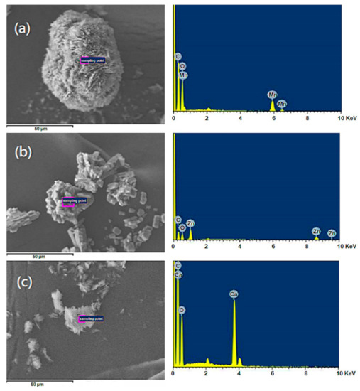 In our previous research [26], the M(HEEP)2 with metals of Mn, Zn, and Ca were synthesized with yields of 43%–55%. In this study, a modified process by introducing a glass water separator and using thermal insulation materials to maintain the whole system temperature at 120 °C was investigated. In this modified synthesis, the condensed acetic acid and H2O, which were produced from the side reaction as shown in Figure 1, were removed from the reaction, and more M(HEEP)2 was produced. Furthermore, in the purified process of M(HEEP)2, the ethyl acetate/xylene eluents were used to replace the acetone/methanol/xylene used in our previous report [26]. The result showed that the low hygroscopicity of eluents could avoid the dissolution of M(HEEP)2 during the repeating purified processes. After the modified process, the yield of Mn(HEEP)2 could be increased from our previous study of 54% to 85%, Zn(HEEP)2 from 55% to 83%, and Ca(HEEP)2 from 43% to 73%. The lower yield of Ca(HEEP)2 was due to the washing consumption resulting in the low specific gravity of Ca(HEEP)2 powder and floating easily from the precipitation. The appearances of the M(HEEP)2 powders were milk-white in color, except the Mn(HEEP)2 powder was a pink color as the described in our previous report [26]. The morphology of M(HEEP)2 was inspected by the FE-SEM, and the results are shown in Figure 2. The Mn(HEEP)2 was piled to a spherical shape, a sheet shape of the Zn(HEEP)2, and a columnar shape of the Ca(HEEP)2. Compared with our previous study [26], the morphology and size of M(HEEP)2 powders were more homogeneous due to the reduced dissolving-reprecipitating behavior of M(HEEP)2 in the purification process, which led to more even nucleation produced [29]. In addition, the EDS analysis, as shown in Figure 2, also showed that the Mn(HEEP)2 contained 6.4% Mn element, 7.1% Zn element for the Zn(HEEP)2, and 6.5% Ca element for the Ca(HEEP)2. The results further revealed that the M(HEEP)2 powders were successfully and stably synthesized by the modified processes.