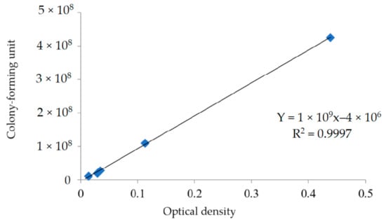 The calibration curve of ODS and bacterial concentrations by the spreading plate method in the antibacterial test against E. coli.