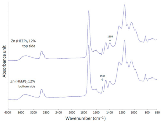 Furthermore, the metal-containing powders precipitate in the bottom of UV films during the curing process or that move to the surface through the eluents’ evaporation [40], which affect the antibacterial activity of the functional UV films and the top side and bottom side of free UV film, were determined by the ATR-FTIR to inspect the homogeneity of the Zn(HEEP)2 distribution, and the results are shown in Figure 4. The peaks of 1538 and 1398 cm−1 were associated with the symmetry and asymmetric stretch vibrations of COO- structures of Zn(HEEP)2, and both of the two spectra were not noticeable different between the top and bottom surface of the UV film. This result demonstrated that the Zn(HEEP)2 were evenly filled in the UV film.